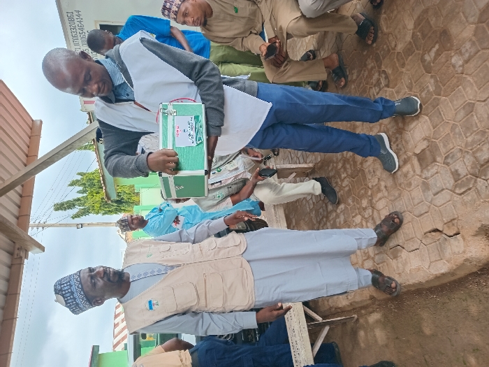 This image depicts an outdoor scene in Rigachikun, Nigeria, featuring multiple adult males under a partial wooden beam structure that provides shade. The ground immediately visible is paved with hexagonal, earth-toned concrete pavers exhibiting cracks, which transitions into exposed earth beyond. In the foreground, a bald male individual, wearing a grey long-sleeved shirt, blue trousers, and a white bib-style vest, is centrally positioned. He is actively handling a rectangular, light green metallic box equipped with silver latches and a silver carry handle. A label on the box is partially visible, displaying text including "FHC" and "SEC". His attention is directed at the box. To the left of this individual stands another male, distinguished by a dark beard. He is dressed in a light grey traditional kaftan, a beige sleeveless utility vest bearing a blue and white circular emblem on the left chest pocket, and brown sandals. He is observing the man handling the box. In the background, a light green building is visible, affixed with a white sign displaying two distinct numerical sequences. Several other males are present in the scene: one in a light blue traditional kaftan and cap stands with his arms crossed, observing the central activity. Two additional males are seated on a light-colored wooden bench to the right, one of whom is in a light brown traditional kaftan and is holding a mobile phone. A wooden utility pole and green foliage are discernible in the distant background.