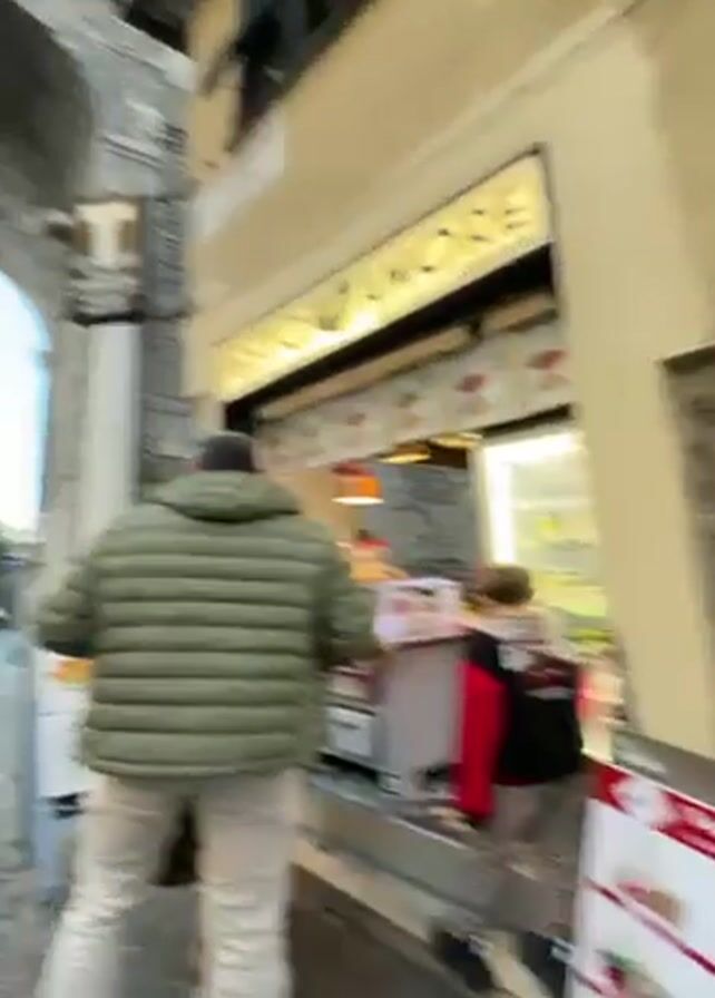 street scene in Genoa, Italy. In the foreground, a small shop called "Pesto Per Amore Genova" is visible. A family, consisting of two adults and a child, are looking at the products inside the shop. The shop has a display of pestos, and a person wearing a red jacket is helping the customers. Next to the shop is a Christmas-themed decoration made of green foliage with red ornaments. The backdrop shows an old stone archway with a sign, a bright blue sky, and other buildings. People are walking under the archway. The video is shot from a slightly low angle, and the camera moves up and down.