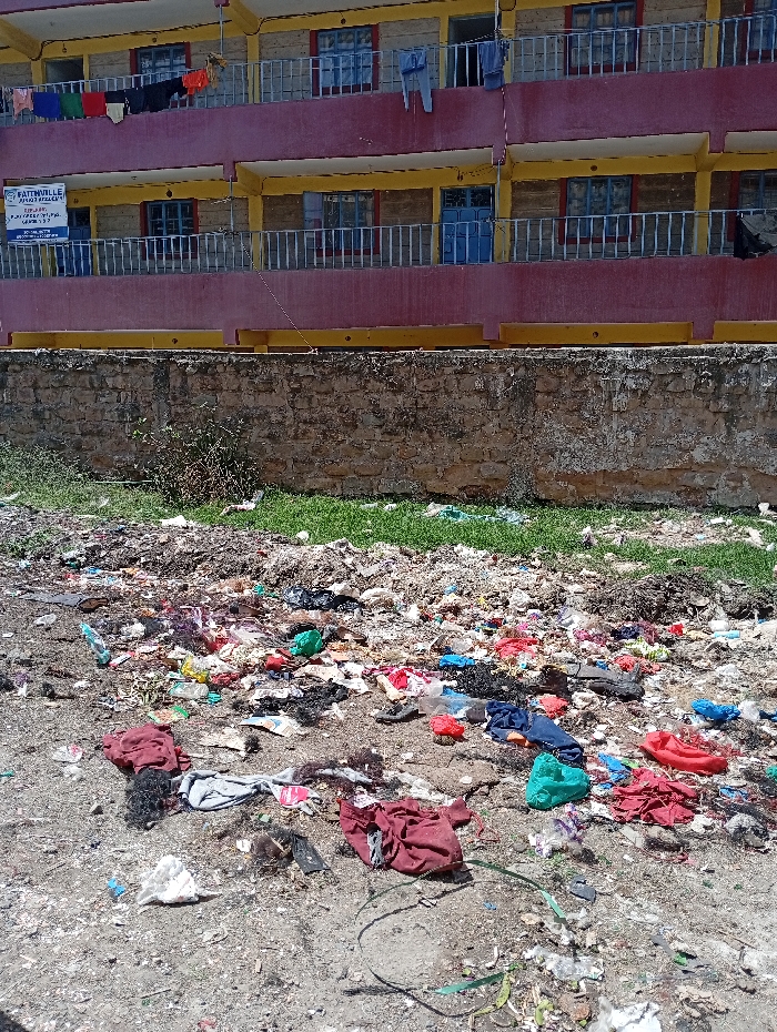 The image depicts a three-story residential building, identified by a sign as "NATTOWNVILLE STUDIO APARTMENTS," located in Nairobi, Kenya. The building's exterior features a maroon facade with yellow-painted accents around the windows and balconies. Each floor presents multiple blue-framed windows fitted with white metal security grilles. White metal railings enclose the balconies on each level, with various items of laundry, including shirts and trousers, hanging on lines across the upper two balconies. In the midground, a weathered stone wall, approximately one meter in height, runs horizontally across the frame, separating the building from the foreground. A narrow strip of sparse green grass is visible between the wall and the building. The immediate foreground is an unpaved area of dirt and gravel, extensively covered with an accumulation of diverse refuse. This refuse includes numerous plastic bags of various colors (red, green, black, clear), discarded clothing items (red and grey fabric, dark blue material), plastic bottles, and distinct clumps of dark, fibrous material scattered across the ground.