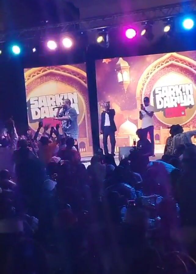 live music performance at an outdoor venue. A crowd is visible in the foreground, many with their hands raised, indicating they are enjoying the show. On stage, three performers are visible under bright stage lighting. Two large video screens flank the stage, each displaying the text "SARKIN DARIA." The performance appears energetic, and the atmosphere seems lively. The event is taking place at night, with the outdoor venue open to the sky.