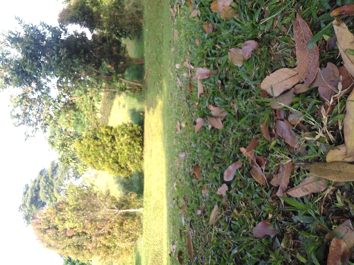 This image presents a low-angle, ground-level view of a verdant outdoor landscape located in Morgedal, Norway. The foreground, occupying the lower third of the frame, is covered in short, dense green grass. Scattered across this grass are numerous dry, fallen broad-leafed deciduous leaves, predominantly brown and reddish-brown, varying in size and exhibiting visible vein patterns and occasional lighter undersides. The midground consists of a gently upward-sloping expanse of well-maintained green lawn, appearing brighter due to direct sunlight. The background features a cluster of diverse trees against a bright, hazy sky. From left to right, a medium-sized tree with reddish-brown foliage and a light-colored trunk is visible. To its right, a dense, round-canopied tree with bright green foliage stands. Further right, a taller tree with darker green leaves and multiple visible stems is present, followed by a partially visible tree with reddish foliage on the far right. A dense line of assorted green trees forms the distant horizon against a nearly white, overexposed sky. The scene is brightly illuminated, indicative of daylight conditions, with soft shadows. No individuals, animals, man-made structures, or specific actions are discernible within the frame.