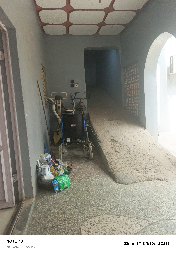This image displays a semi-covered passageway located in Gwammaja, Nigeria, captured on January 22, 2026, at 12:05 PM. The area features light grey-painted walls and a white ceiling adorned with a reddish-brown octagonal grid pattern. The floor is terrazzo-style, exhibiting light grey and beige tones with a distinct, curved demarcation line. On the left, a light-colored door frame is partially visible. A tall, dark pole leans vertically against the wall, below a high-set, narrow window with a yellow tint. At floor level, a black basin contains miscellaneous household items including toilet paper rolls, plastic containers, and small packages; a green plastic bag rests nearby. Adjacent to the left wall and preceding a substantial concrete ramp, two pieces of equipment are present: a stationary exercise bike with white handles and a beige frame, and a blue-framed rollator or wheeled walker featuring a black fabric seat/storage compartment. Above these, two small, dark electrical boxes are affixed to the wall. The central feature is a wide, upward-sloping concrete ramp, textured with loose sandy material, that leads into a darker, unseen area. To the immediate left of the ramp, a dark arched doorway opens into a dim interior. To the right of the ramp, a larger archway provides access to a brighter exterior space, where a rectangular vent is visible on a distant white wall and a reddish-brown patterned grate is integrated into the wall adjacent to the ramp. No individuals are visible within the frame.