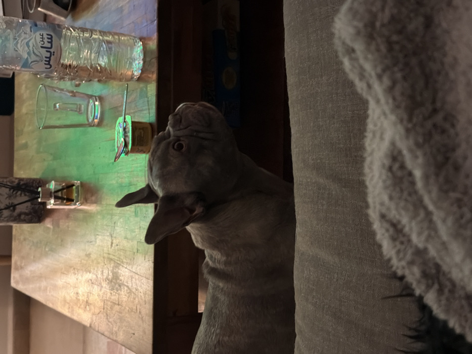 This image depicts an indoor scene in Marrakesh, Morocco, featuring a French Bulldog and items on a wooden table. A gray-blue French Bulldog is positioned in the lower-left to mid-frame, with its head and upper body visible, appearing to be sitting or standing on a gray, textured cushion or furniture. The dog's ears are erect, and its eyes are directed towards the right side of the frame, specifically towards items on the table. Its muzzle is wrinkled, characteristic of the breed. In the foreground, a soft, light gray, textured blanket or throw is partially visible in the bottom right corner. Above the dog, a light-to-medium brown wooden table with visible grain and minor surface marks occupies the upper portion of the image. A distinct green light casts a glow across a significant area of the table's surface. Arranged on the table, from left to right, are several objects: a small, square glass bottle containing a dark liquid and multiple black reeds, likely an air freshener or diffuser; a clear, empty glass cup with a handle; a clear plastic water bottle with "عين سايس" (Ain Saiss) in Arabic script and mountainous graphics on its label; and a small, circular, translucent container with a bright green lid, holding a yellow substance, with a small silver spoon resting on top. The background behind the table is dimly lit and indistinct, revealing a darker brown shelf or surface underneath the table. No people are visible in the scene.