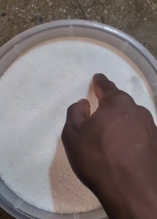 A hand is moving in a circular motion inside a round, plastic container filled with granulated white sugar. The hand has dark skin. The container is light-colored. The background is a speckled, light brown surface.