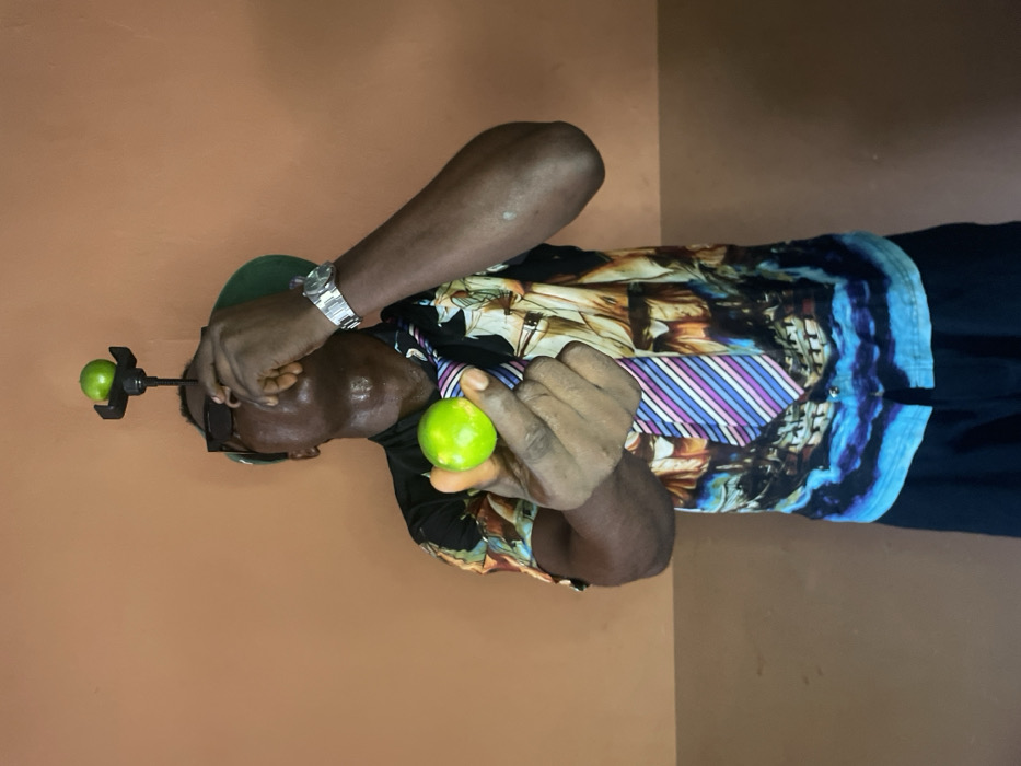 A dark-skinned adult male is depicted chest-up against a plain, light brown wall in Mosafejaw, Nigeria. He is wearing a short-sleeved, multi-colored button-up shirt featuring a sailing ship motif, a diagonally striped tie in purple, pink, and white, dark trousers, a green cap, and dark sunglasses. A silver-toned wristwatch is visible on his left wrist. His head is tilted upwards, balancing a small, spherical, bright green object on a black mechanical device, possibly a clamp or stand, situated on top of his head and secured by the cap. His right hand is extended forward, holding a second identical bright green object. His left hand is raised towards his mouth/nose area. Perspiration is visible on his neck. The lower section of the wall appears slightly darker. The scene suggests a performance or act of skill.