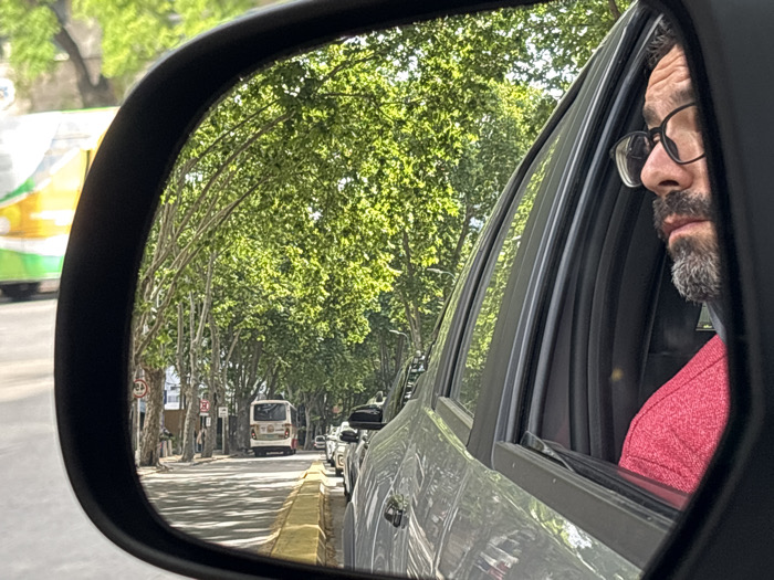 The image depicts a street scene viewed primarily through the driver's side mirror of a light-colored vehicle. A male occupant is partially visible in the vehicle's interior, to the right of the mirror. He possesses a dark, salt-and-pepper beard, wears black-framed eyeglasses, and is dressed in a red, textured garment. He is observed looking forward and slightly right, away from the camera. The reflection in the side mirror shows a tree-lined urban street, illuminated by sunlight which casts dappled shadows. Numerous trees with dense, bright green foliage line both sides of the thoroughfare. A paved road runs through the center, flanked by a yellow-painted curb on the right. Multiple passenger cars are parked bumper-to-bumper along this curb. Further down the street, a light-colored public transport bus is visible, facing away from the viewer. On the far left, partially obscured by the mirror's frame, is a portion of another public transport vehicle displaying green and yellow livery, consistent with common bus liveries in Montevideo, Uruguay. The scene represents a typical tree-lined avenue within the city of Montevideo, Uruguay.