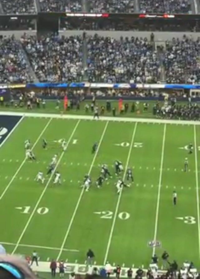 n American football game in a packed stadium, filmed from an elevated spectator position