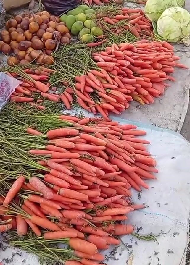 The video displays a vendor's fruit and vegetable stall, with the produce arranged on a light-colored tarp or cloth on the ground. The main feature of the display is a large quantity of fresh carrots in bundles, with their green tops still attached. These carrots are predominantly orange in color. To the left of the carrots, there are piles of round, brown fruits, some light green mangoes, and a black bag containing something orange that is not immediately distinguishable. To the right of the carrots are at least two heads of cabbage. People pass by in the background.