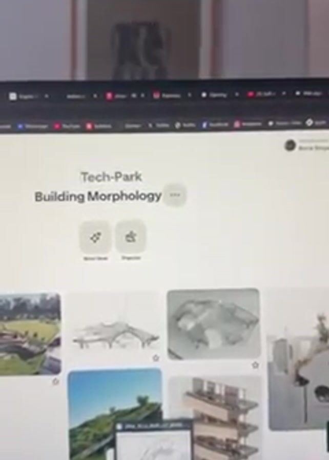 A monitor displays architectural plans. The screen transitions from a Pinterest board titled "Tech-Park Building Morphology" to architectural floor plans. The plans show circular buildings connected by a snaking pathway, labeled with details such as room names (lobby, reception) and areas in square meters. The architectural software interface surrounds the plan, and the top of the screen reveals tabs for various websites and social media platforms. Above the monitor, a framed artwork is visible.