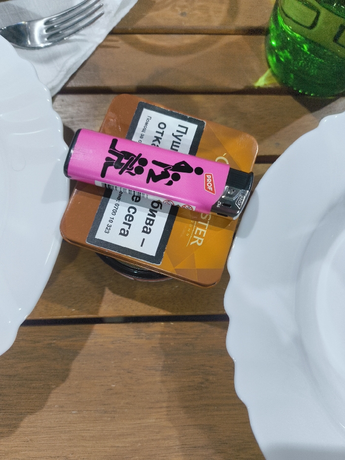 The scene depicts a tabletop setting in Bankya, Bulgaria. A pink plastic lighter, branded "PROF" and featuring black silhouettes of figures in various intimate positions, rests diagonally on a brown cigarette pack. The cigarette pack displays two prominent Cyrillic warning labels: "Помощ за отказване от тютюнопушене - 0700 10 323" (Help with quitting smoking - 0700 10 323) and "Пушенето убива - 0700 10 323" (Smoking kills - 0700 10 323), with partial text "STER" visible on the lower right, indicating a Bulgarian product. These items are positioned on a wooden table composed of horizontal planks with visible grain. Partially visible on the left is a white ceramic plate with a decorative wavy rim, accompanied by a silver fork resting on a white napkin. On the right, another similar white ceramic plate is partially visible. In the upper right corner, a textured green glass is also partially visible. No individuals are present in the frame, and no specific actions or interactions are occurring.
