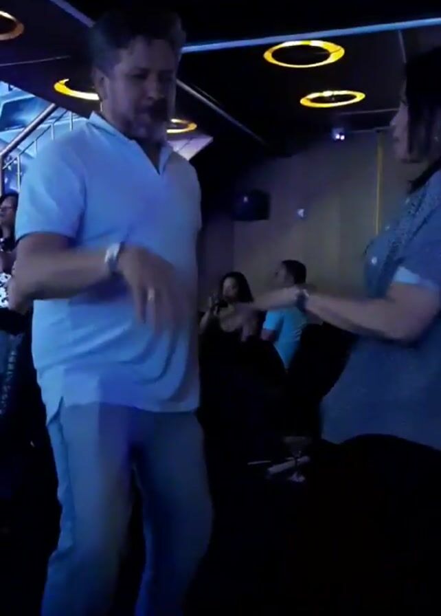 A short video shows a middle-aged man and woman dancing in what looks like a lounge or nightclub