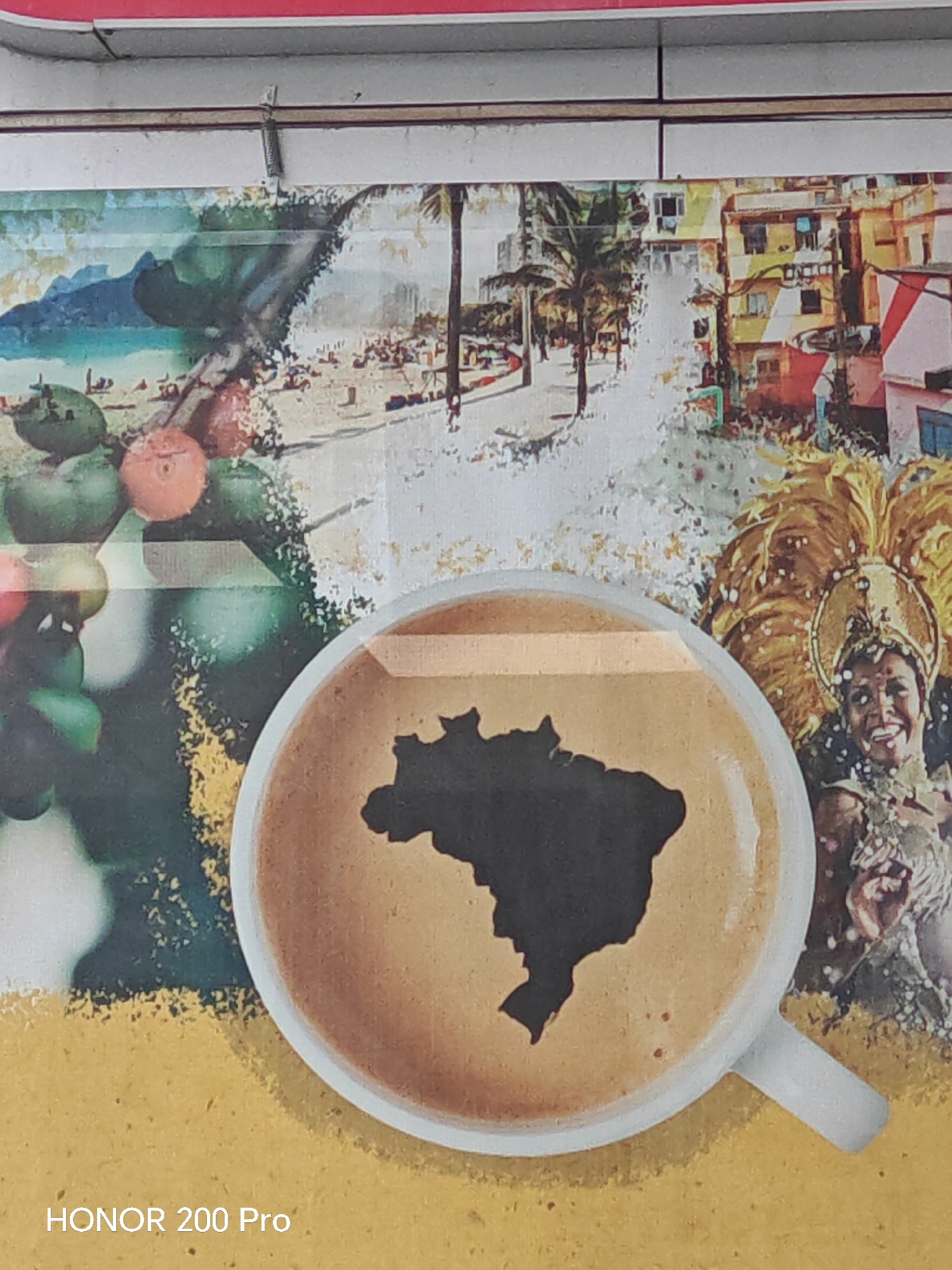 This image displays a close-up of a worn promotional poster or graphic display located in the city of Belozem, Bulgaria. The central element of the poster is a white coffee cup containing a light brown beverage, which features a dark silhouette of the geographical map of Brazil as latte art. The cup's handle is visible towards the bottom right. The background of the poster presents a composite of Brazilian themes: to the left, a beach scene with turquoise water, a sandy shore populated by small figures, and palm trees, partially overlaid by green coffee beans and red berries on a branch. To the right, colorful buildings suggestive of an urban Brazilian landscape are visible, alongside a smiling person adorned in an elaborate gold and yellow feathered carnival costume and headpiece. The poster itself shows visible creases and wear. It is affixed to a light-colored horizontal panel by a small, silver-colored spring clip located at the top center. A narrow red strip is visible above the panel. The bottom left corner of the photograph contains a "HONOR 200 Pro" watermark.