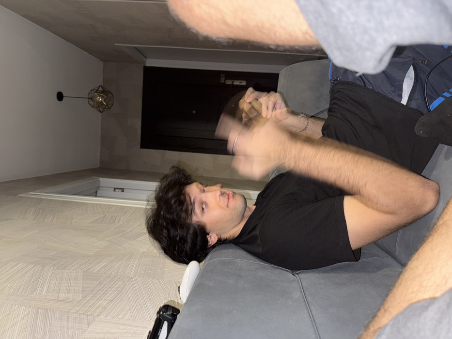 The image depicts an indoor residential scene. A male individual with dark, wavy hair and a black t-shirt is seated on a light gray upholstered sofa, looking towards the camera with a slight smirk. His right arm is raised and blurred due to motion, holding a translucent, possibly glass, object. A silver bracelet is visible on his left wrist. To his left, on the sofa's backrest, a black gaming controller and a white gaming controller are visible. In the immediate foreground, out of focus, are the legs of another individual, clothed in gray fabric. The background reveals a hallway with textured wallpaper featuring a light-colored, repeating geometric or striped pattern. A dark brown or black door is visible at the end of the hallway, with a brass-colored handle. A decorative, geometric-shaped light fixture hangs from the ceiling in the hallway. The floor area near the seated male's feet shows dark fabric, possibly shorts or a bag, and black socks. The exact location within the city of Tbilisi, Georgia, cannot be determined from the visual information provided.