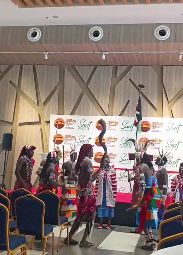In a brightly lit indoor venue, a group of people performs a traditional dance. They are dressed in colorful, ethnic clothing, adorned with beads and feathers. Some hold spears and a large, curved horn. A person near the center of the group holds a flag of Kenya. The backdrop features a logo repeated several times. Seated chairs are visible in the foreground, suggesting an audience. The room has a modern design with a wooden slatted ceiling and recessed lighting.