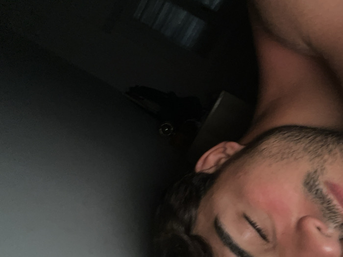 The scene is located in Avellaneda, Argentina. The image presents a close-up, rotated view of a single male individual in a dimly lit indoor environment. The man's head is positioned towards the bottom right of the frame, with his body extending diagonally upwards towards the right. His right ear, the right side of his face, neck, and a portion of his upper right shoulder are visible. His eyes are closed, indicating a state of rest or sleep. He possesses short, dark hair and dark stubble covering his chin and jawline. A noticeable reddish flush is present on his right cheek. In the upper left background, faint vertical linear patterns suggest the presence of window blinds or drapes. Behind the individual's shoulder, in the mid-right background, an indistinct, dark object consistent with furniture is partially visible, along with a small, circular, reflective point. The room is characterized by low ambient light and dark, shadowed surfaces.