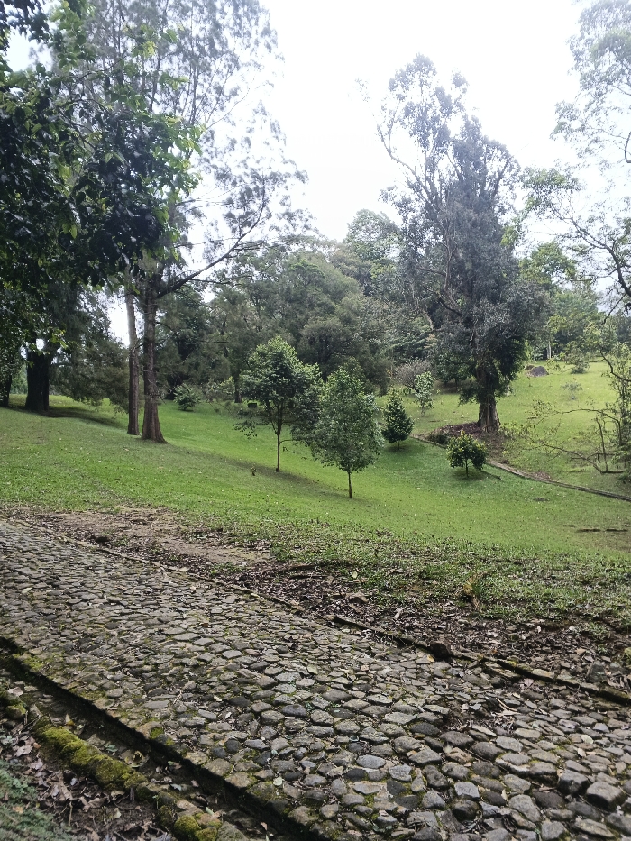 The image depicts an outdoor natural landscape in the city of Tây Ninh, Vietnam. In the foreground, a cobblestone path, constructed from irregular dark grey stones, angles upward from the lower left towards the right. Patches of moss and scattered dry leaves are present on the path and its immediate periphery. The midground comprises a prominent, undulating green grassy slope. Several trees are distributed across this slope: two tall, slender specimens with dark trunks are positioned on the left; two smaller trees with light green canopies stand centrally; and a large, mature tree with a thick, dark trunk and dense foliage is visible on the right. The background reveals a dense, dark green forested area ascending towards a bright, featureless white sky. No human or animal subjects are visible, and no actions are occurring within the static scene.
