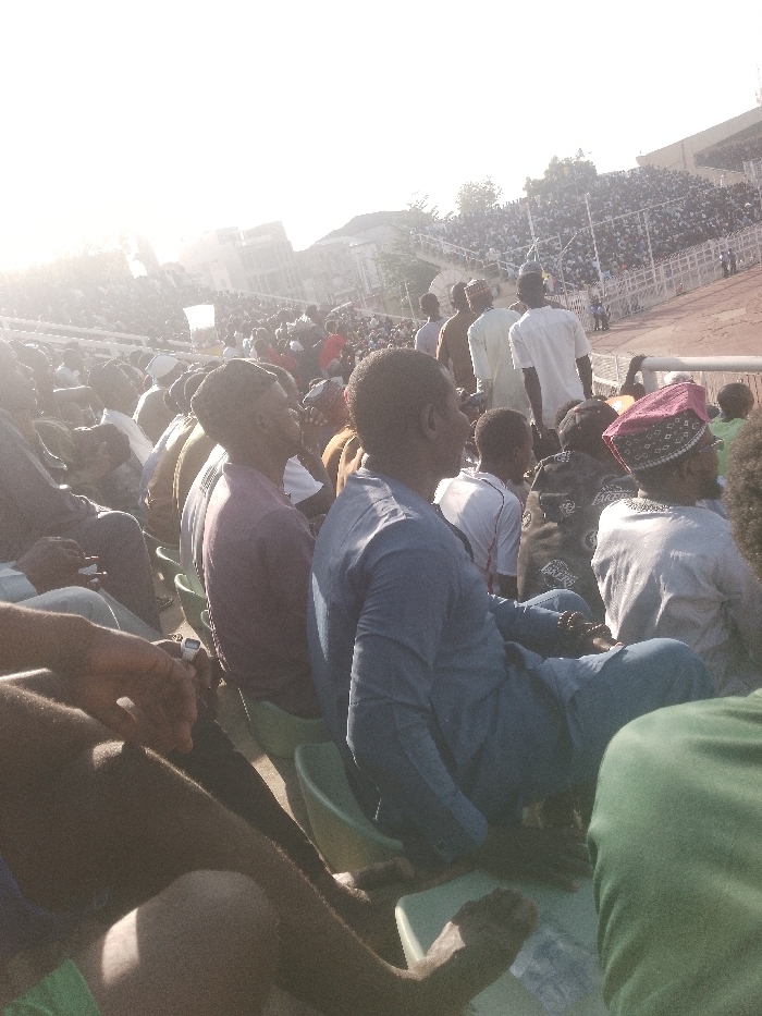 This image depicts a large outdoor gathering within a stadium, likely Sani Abacha Stadium in Kano, Nigeria