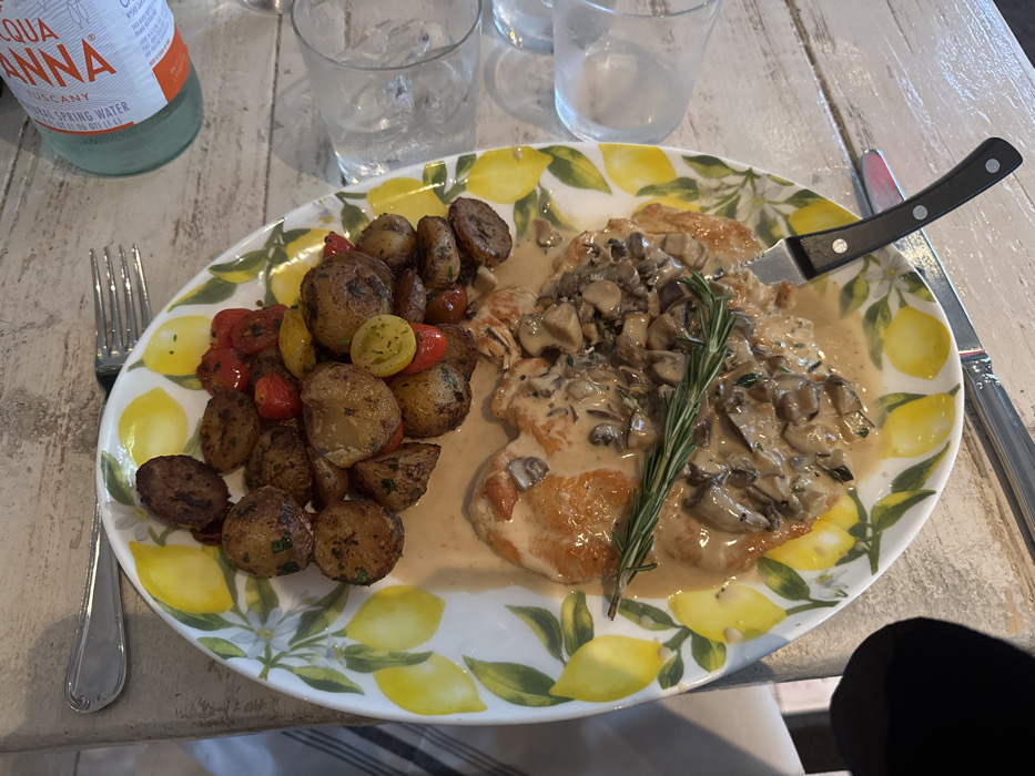 This image depicts a meal served on a light-colored, rustic wooden table in an indoor dining environment within Miami Beach, United States. The central subject is an oval white plate, adorned with a yellow lemon and green leaf pattern around its rim. The plate holds a prepared meal consisting of two pieces of what appears to be pan-seared chicken or cutlets, generously covered in a creamy mushroom sauce. A sprig of fresh rosemary garnishes the top of the chicken and sauce. Adjacent to the chicken, occupying approximately one-third of the plate, is a portion of roasted small potatoes, some appearing halved, intermingled with roasted red and yellow cherry tomatoes. To the upper right of the plate, a clear glass bottle of "ACQUA PANNA" natural spring water from Tuscany is visible, standing upright. Directly below the water bottle and to the right of the plate are two clear drinking glasses; one is mostly empty, containing ice cubes, and the other is partially visible. A silver dining fork with a decorative handle is positioned horizontally above the plate, and a silver knife with a black handle rests partially on the plate and table on the lower right. Another silver fork is partially visible to the far left of the plate. A dark, out-of-focus object, possibly clothing, is present in the bottom left corner of the frame. No individuals are visible, and no actions or interactions are depicted; the scene is static, presenting a prepared meal.