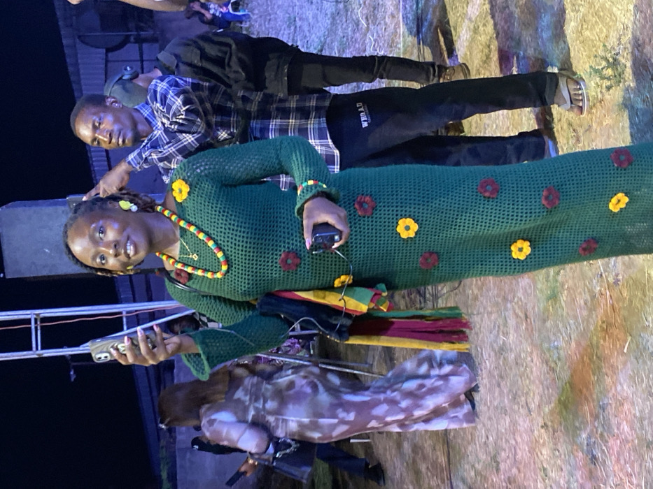 Three people are outdoors. A woman in a green crochet dress decorated with yellow and maroon flowers poses, holding a phone. She wears a rasta-colored necklace and earrings. Behind her, a person in a patterned brown and white dress stands slightly out of focus. Behind them is a man in a plaid shirt and black pants with white text. They are standing on grass.