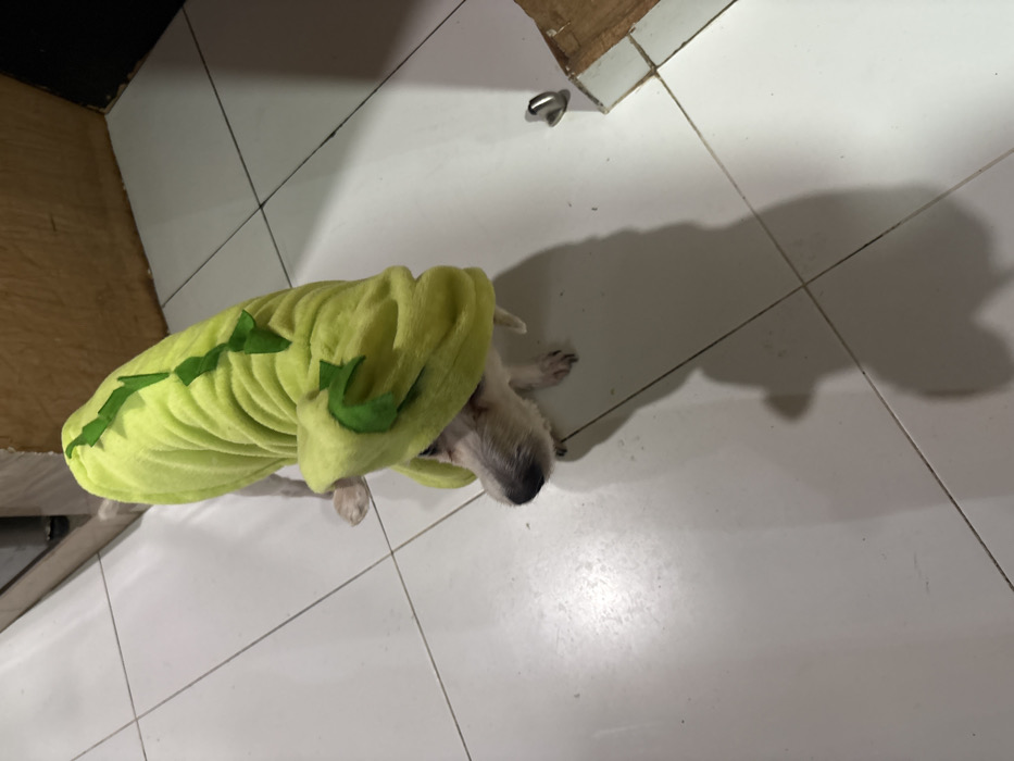 - "A small dog wears a green, squash-shaped costume while lying on a tiled floor" by FM-Hcex03, licensed under CC BY 4.0