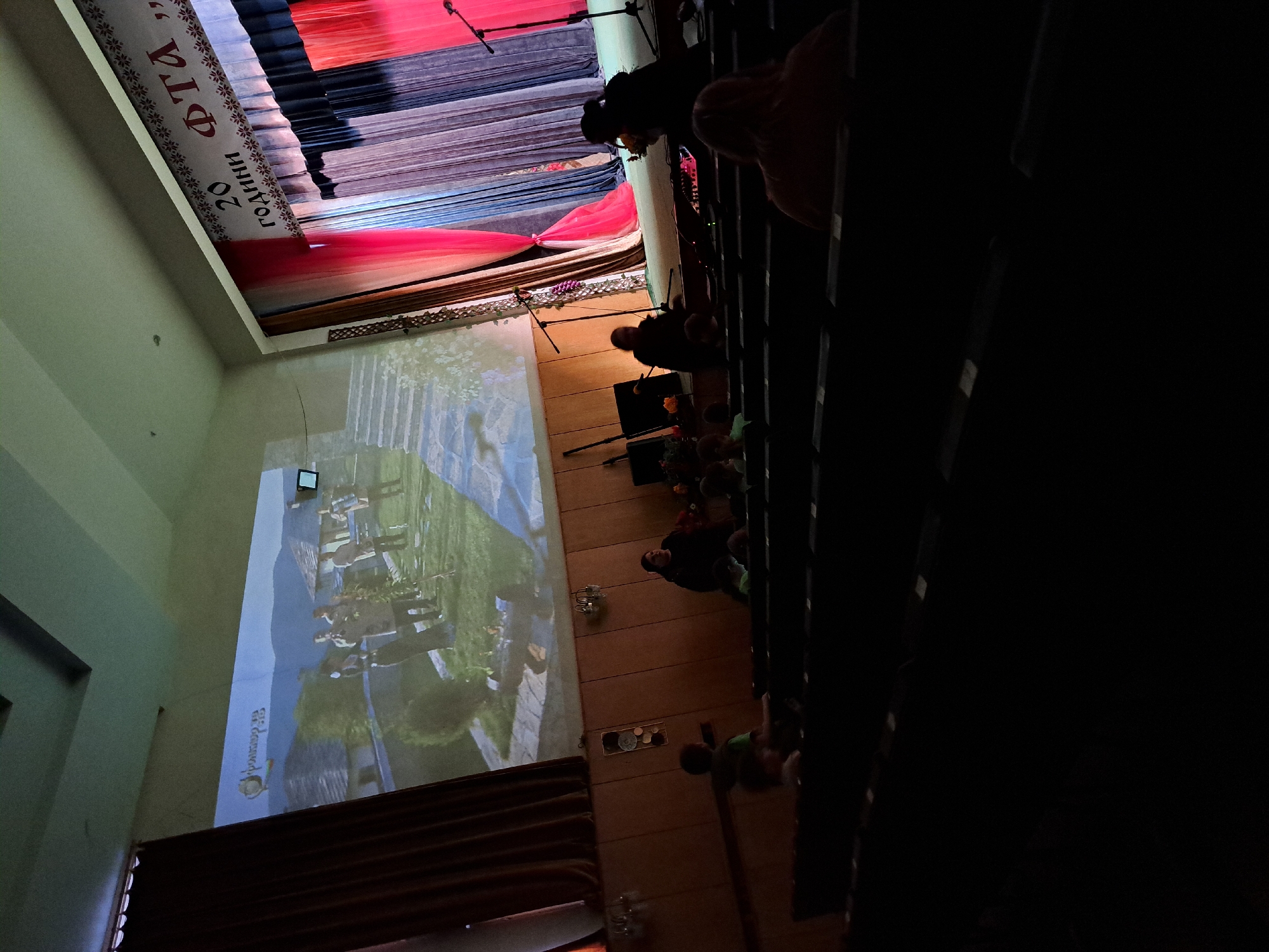 A partially lit auditorium in Lokorsko, Bulgaria, shows a large screen projecting a historical image