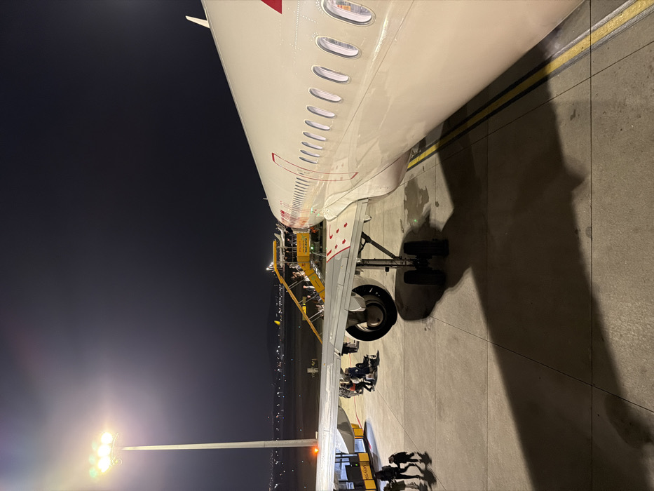 An airplane at night, illuminated by floodlights, stands on a tarmac with its wing extending towards the left. Passengers disembark using a mobile staircase attached to the plane's side. The aircraft is painted white with red accents, and numerous windows line its fuselage. The airplane's shadow stretches across the pavement. People are walking on the tarmac. City lights are visible in the background.