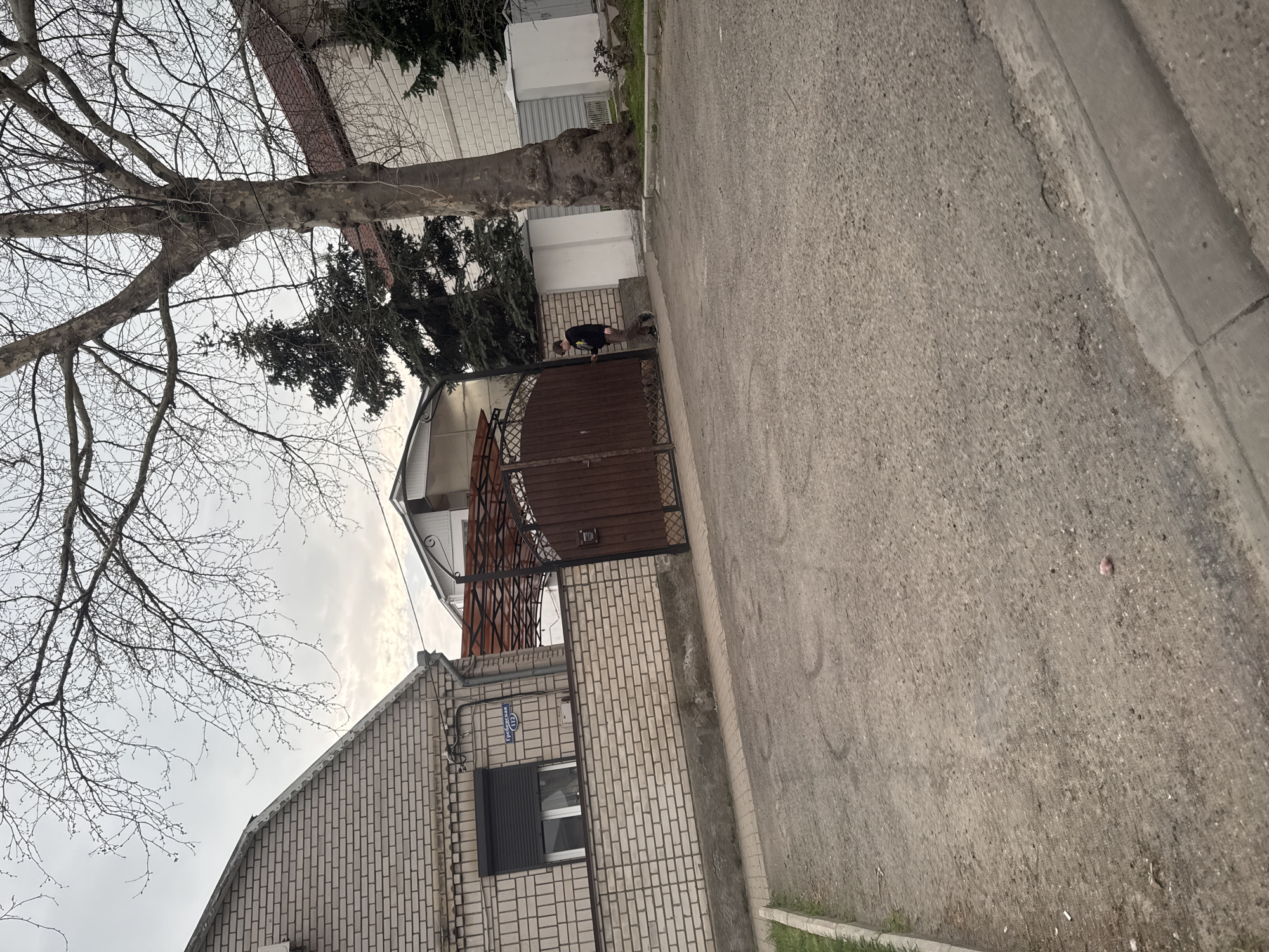 street scene in Anapa, Russia. A two-story brick building with a dark window and a sign is visible. A wooden gate with a metal frame stands in front of the building, with a partially obscured figure bent over near the gate. A large, bare tree is on the left, and a paved road stretches along the right side of the frame. A white building with greenery is visible in the background.