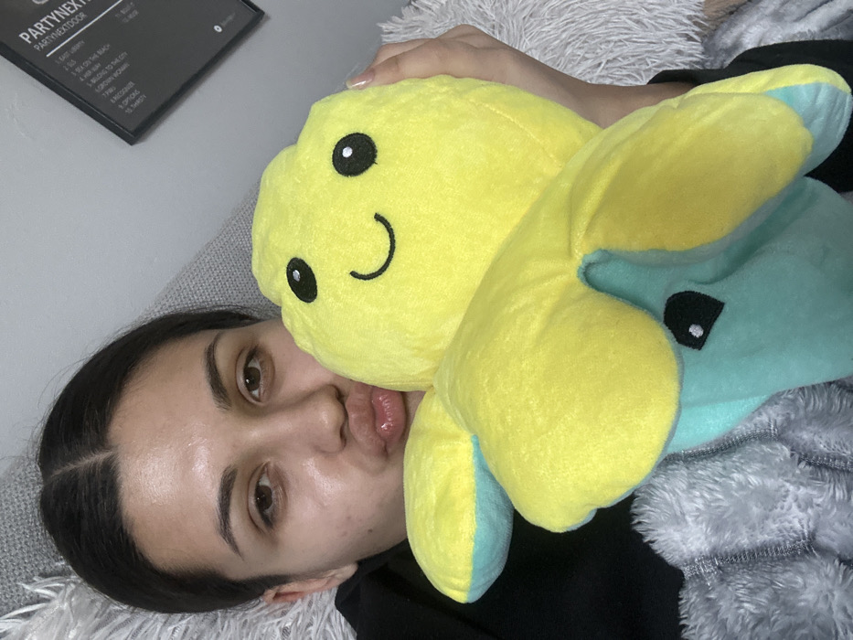 A female individual is depicted in a close-up, indoor setting. She has dark hair, parted in the middle and pulled back, and possesses brown eyes. Her lips are pursed forward. She is wearing a dark, possibly black, garment. The individual is holding a plush toy against her upper torso. The toy is predominantly yellow and teal, featuring two black oval eyes and a black curved smile on its yellow upper section. Its lower body is teal with yellow appendages. A grey, fluffy textile, appearing to be a blanket or pillow, is visible behind and below the individual. In the upper right background, a dark-framed item, consistent with an album poster, is visible on a light-colored wall. Identifiable text on this item includes "PARTYNEXTDOOR" and a partial tracklist (e.g., "1. EAST", "3. SEX ON THE BEACH"). The precise location within the city of Vidin, Bulgaria, cannot be determined from the visual information provided.