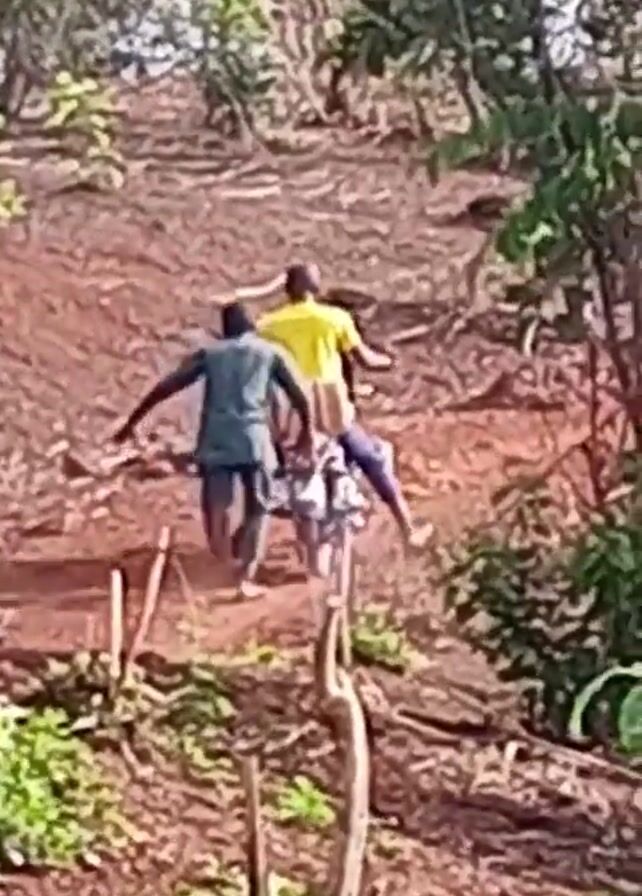 Two people are struggling to move a motorcycle up a steep, reddish-brown dirt hill dotted with vegetation and tree stumps. The person in the front is wearing a yellow shirt, and is seated on the motorcycle, while the person behind is wearing a blue shirt and appears to be pushing the bike from the back. The scene is framed by green trees and bushes on either side of the path.