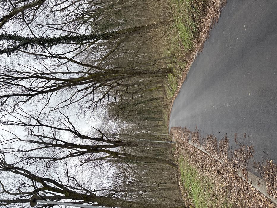 The image displays a paved asphalt road winding through a deciduous forest in Nikolovo, Bulgaria, under an overcast sky. The road, dark gray and appearing well-maintained, curves subtly uphill to the right, receding into the distance. On the left side of the road, a concrete curb separates the pavement from a dirt shoulder densely covered with fallen brown leaves and patches of green ground cover. Two gray metallic streetlights are positioned vertically along the left roadside at intervals. The right side of the road features a sloped embankment, similarly covered in brown leaf litter and sparse, light brown undergrowth. The forest consists primarily of tall, bare-branched trees, indicating a winter or early spring season, with some tree trunks exhibiting moss or ivy growth. No individuals, vehicles, or specific activities are present.