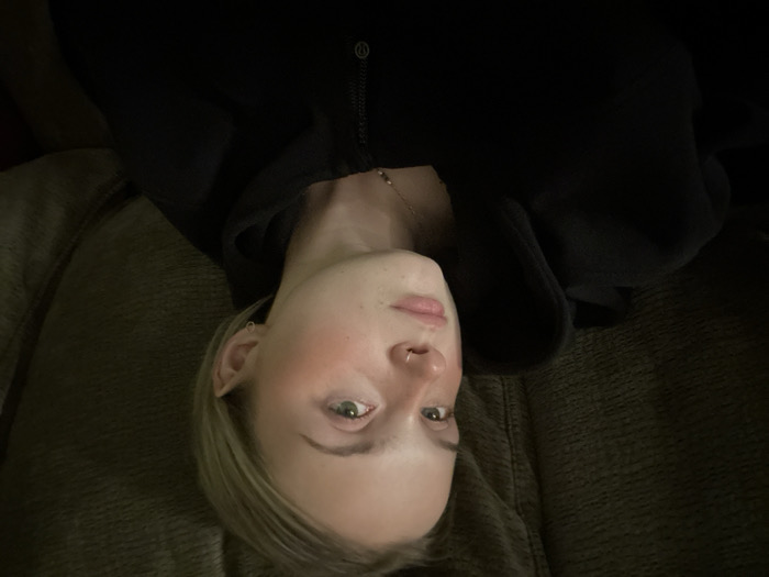 A person lies on a dark couch wearing a black hoodie. Their face is prominent, showing fair skin, light eyebrows, and green eyes. A nose ring is visible. They wear a delicate necklace. The background is dark and indistinct. The image is oriented sideways.