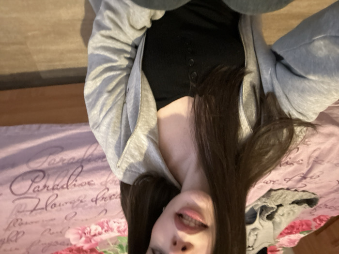 The scene depicts a female individual in an indoor setting, likely a bedroom, in Volkhovets, Russia. The subject has long, dark hair and is looking towards the camera with her mouth slightly open, revealing some teeth. She is wearing a grey hooded sweatshirt with an open zipper over a black, ribbed top with three visible buttons. Her lower body, specifically the top of her legs, is visible, suggesting she is wearing dark-colored jeans. In the background, a bed is visible with a pink or light purple blanket/comforter featuring white floral and script patterns. A grey garment is loosely placed on the bed to the left of the subject. The floor visible at the bottom right consists of light-colored, wood-patterned planks. The lighting is even, suggesting an artificial light source or well-lit room.