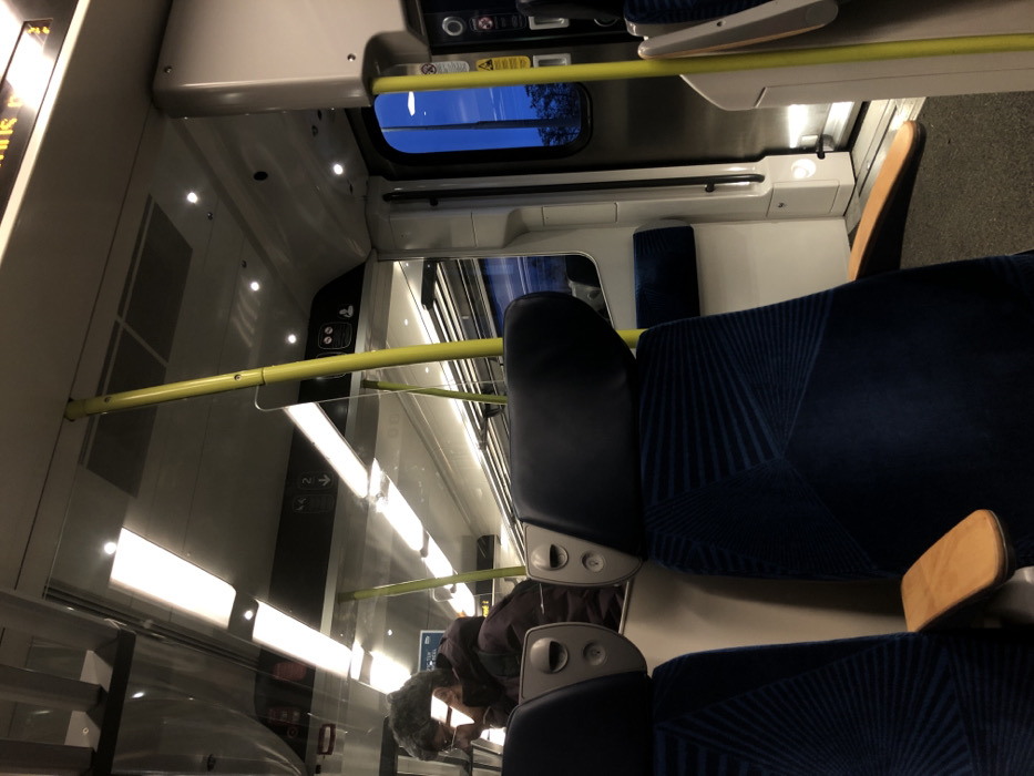 The interior of a train car is depicted, focusing on seating and overhead elements. Blue patterned seats and black headrests are prominent. A yellow handrail runs horizontally. Windows reveal a blue sky and trees outside. In the lower left, a passenger is visible, looking down at a device. Overhead lights illuminate the interior. The car appears clean and modern.
