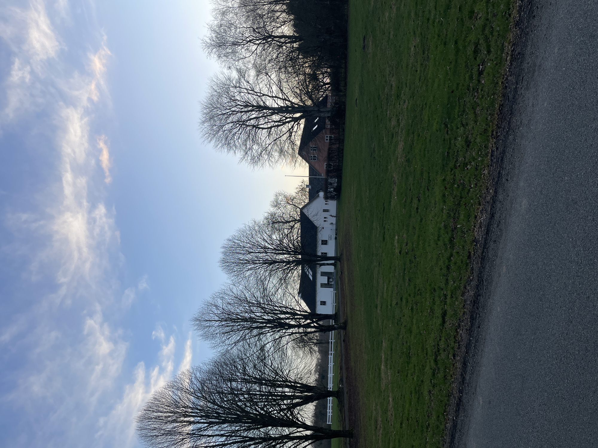 The image depicts a landscape with a road in the foreground on the right. A green grassy field extends to the left of the road. Several bare trees line the edge of the field, partially obscuring two buildings: a white building and a red brick building further back. A white fence is visible near the trees. The sky is blue with wispy white clouds. The location is likely in or near Vejle, Denmark, though this cannot be confirmed solely from the visual content.