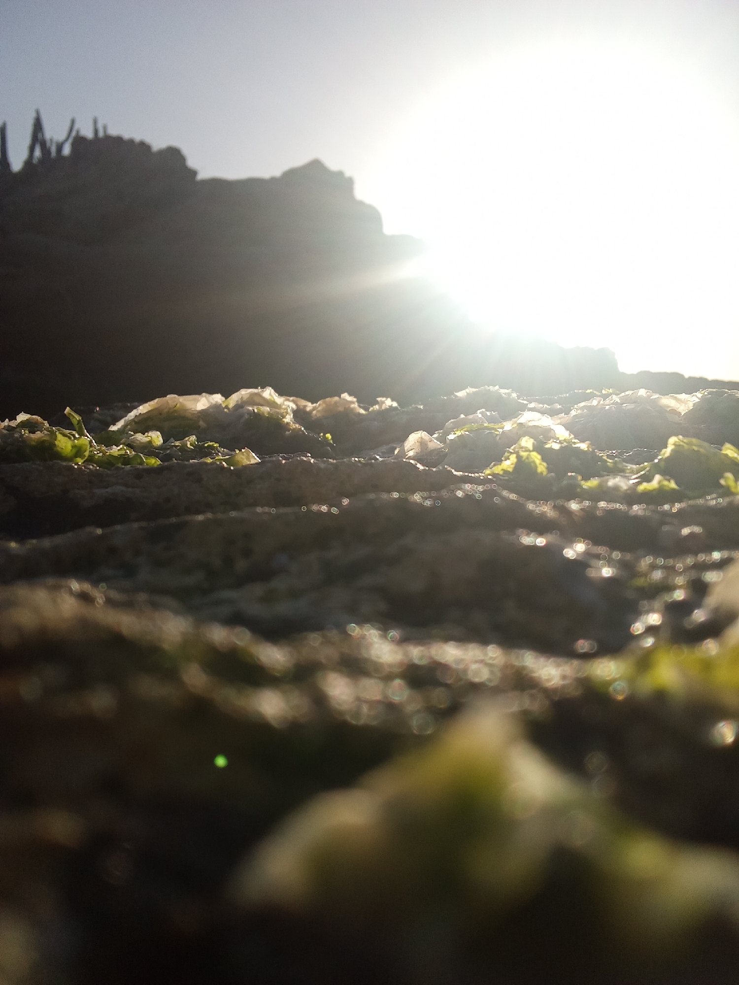 The image depicts a rocky shoreline at low tide, possibly in the vicinity of Juan Griego, Venezuela, although there's nothing in the image to confirm that location definitively. The foreground is a blurred view of barnacle-covered rocks with patches of green and translucent algae. The middle ground shows a more focused view of similar rocks and algae, glistening with moisture and reflecting sunlight. In the background, a dark, indistinct landmass or cliff is silhouetted against the bright sunlight, which is partially obscured by the landmass. The sun's rays are visible, creating a lens flare effect. There is no evidence of people, interactions, or specific actions in the scene.