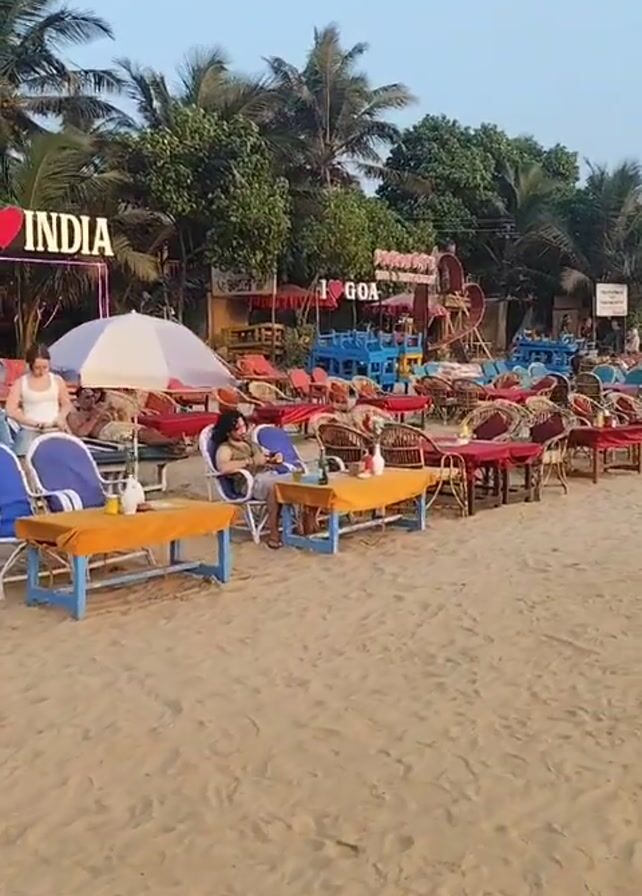beachside restaurant or bar in Goa, India. The scene includes sandy ground filled with rows of beach chairs and small tables, some occupied by people relaxing. There are signs that read "I <3 INDIA" and "I <3 GOA". Palm trees and other greenery stand in the background. A few people are visible, including one walking through the scene. The lighting suggests either early morning or late afternoon.