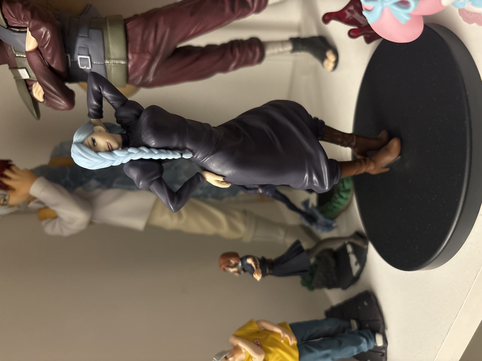 The image depicts a collection of anime figurines displayed on a white shelf. The figurines include characters with varying outfits, hair colors, and poses. One figurine stands out, featuring a woman in a dark purple dress and brown boots, with light blue hair braided down her back. This figurine is on a black base. Other figurines depict male characters in various attire, including one in a brown jacket and another in a yellow shirt and blue pants. The shelf appears to be in an indoor setting, possibly a collector's display. The specific location within the city of Plovdiv, Bulgaria, cannot be determined from the provided image.