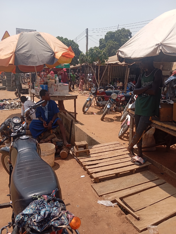 The image displays an active outdoor market scene in Lafia, Nigeria, under a bright, clear sky. The ground consists of unpaved, reddish-brown dirt with scattered debris, including plastic. In the immediate foreground, a black motorcycle is parked on the left, its seat adorned with a multi-colored patterned cloth. Adjacent to it, a man wearing a blue patterned long-sleeved garment and blue skirt-like attire is seated on a low wooden structure, facing right. His bare feet rest near a white plastic bucket and several cut logs. To the right, another man, dressed in a dark green "Lakers" tank top and dark trousers, stands leaning against a wooden market table, his arms crossed. He wears light-colored flip-flops. A makeshift walkway constructed from wooden pallets and planks extends from his position towards the lower right. The mid-ground features several parked motorcycles, including two red models, amidst the dirt path. Two prominent market umbrellas provide shade: one with orange and grey panels on the left, covering a table laden with bottles and packaged goods, and another large, white umbrella on the right, shading the area where the man in the Lakers tank top stands. The background reveals a bustling market environment with multiple wooden and corrugated metal stalls. Numerous individuals, appearing to be vendors and customers, are visible interacting within these stalls and moving through the area. Utility poles and overhead power lines are discernible against the sky, along with distant trees. A stack of vehicle tires is present near a stall in the far left background.