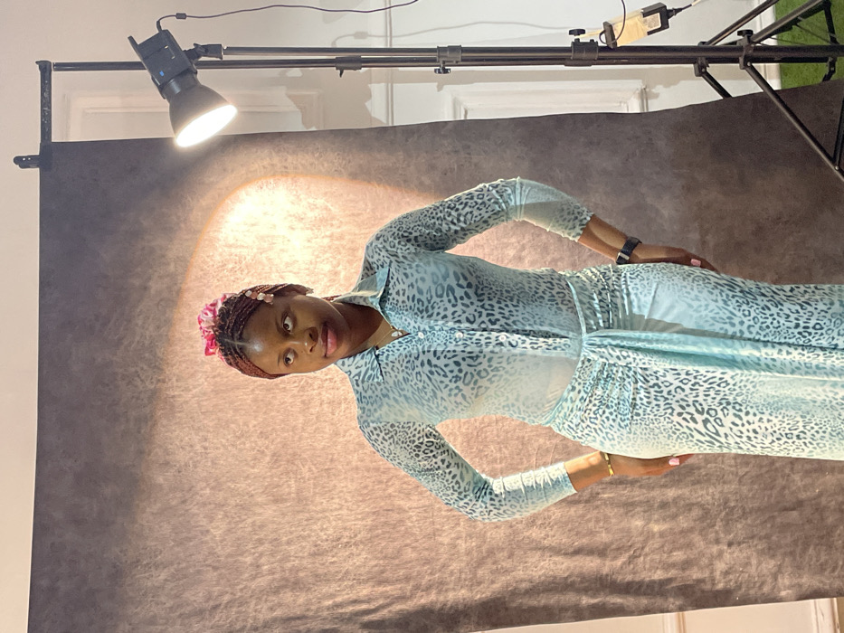 A woman stands sideways in a light blue, animal-print, long-sleeved dress. She has dark skin and braided hair with pink and white accents. Her arms are bent, and her hands rest on her side. A gold bracelet is visible on one wrist. A stage light shines from above onto a wrinkled grey backdrop. Part of the lighting equipment, including stands and a window, is visible in the background.