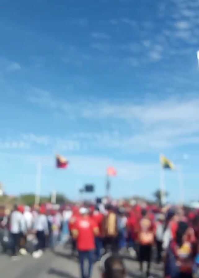 large crowd of people, mostly wearing red shirts, walking on a paved road under a clear blue sky with scattered clouds. The crowd is walking towards a statue that is holding a red flag. Three Venezuelan flags are visible, flapping in the wind. There are palm trees and buildings in the background, as well as street lights lining the road. The camera moves slightly, panning over the crowd. The overall impression is of a political rally or demonstration.