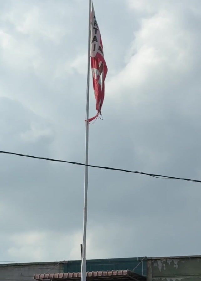 tattered flag on a tall, silver flagpole, set against a sky with scattered clouds. The flag is mostly red and white with some visible lettering. Below, a dilapidated, two-story building with green and white paint is visible. Power lines run in front of the building.