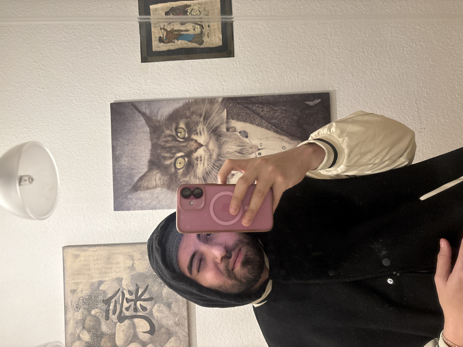 A man in a black jacket and grey hoodie holds a pink phone, taking a mirror selfie. Behind him, on the white wall, are framed pictures: one of an Egyptian scene, another featuring a cat in a tuxedo, and a third with Asian characters. A white lamp fixture is also visible on the wall.