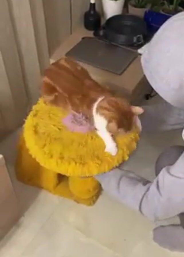 A short video shows a man holding a two-tiered cat bed with an orange and white cat sleeping on top