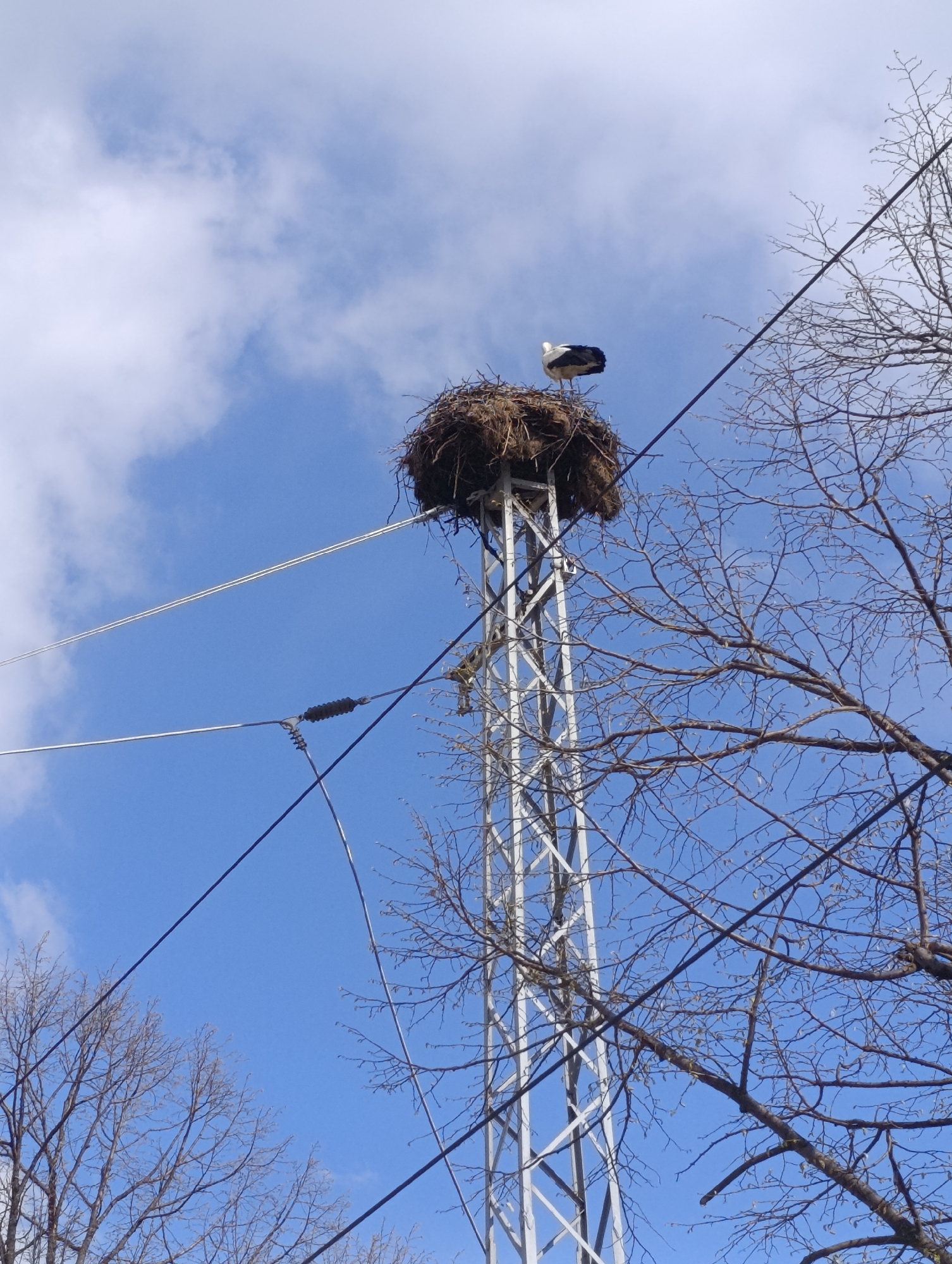- "A white stork stands in a large, disheveled nest made of sticks and straw atop a white, metal lattice tower" by FM-zeMXw2, licensed under CC BY 4.0