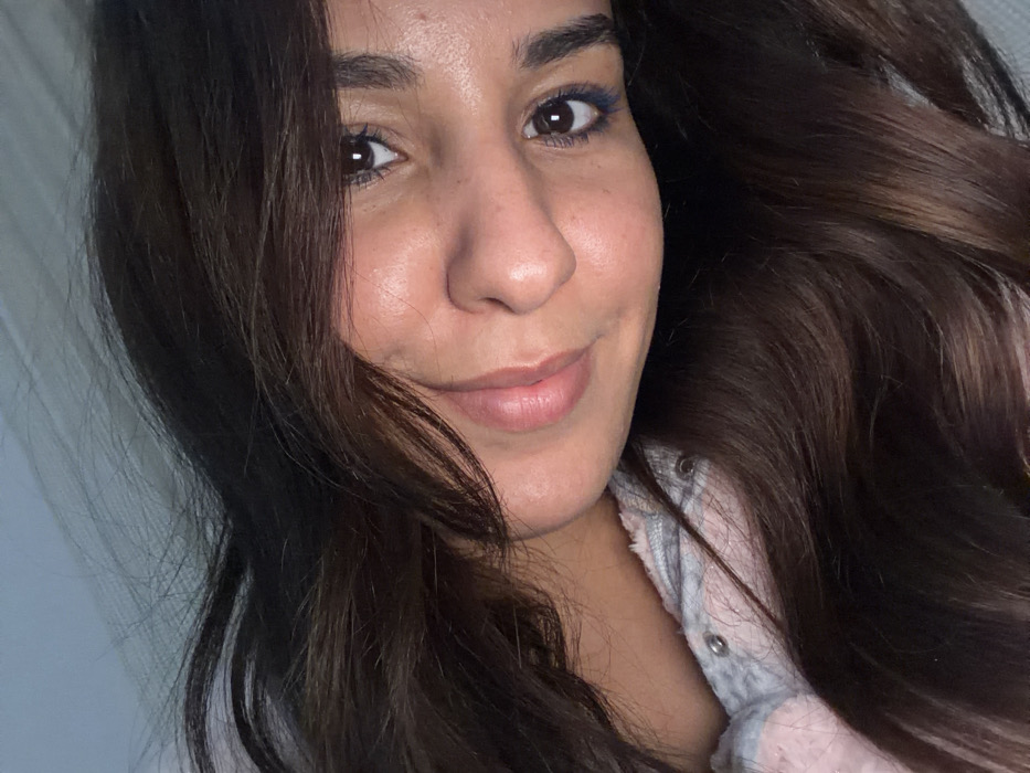 A smiling woman with brown hair poses for a selfie. Her dark brown hair is styled with waves. She has brown eyes lined with dark blue eyeliner. Her skin is clear and dewy. She is wearing a pink and blue patterned shirt with silver snap closures. The background is a muted blue-grey. The lighting is soft and even, highlighting her features.