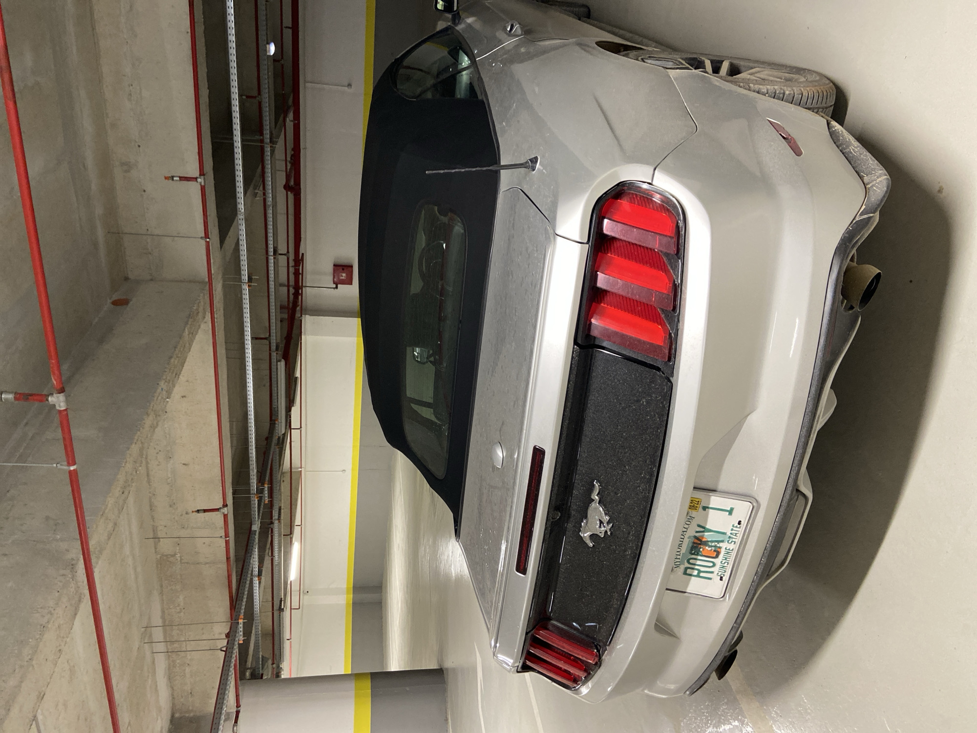 An overhead view captures the rear-left quarter of a silver Ford Mustang convertible parked in an underground concrete parking garage in the city of Dub, Montenegro. The vehicle features a black soft top that is fully deployed. The rear bumper area and a central dark gray panel on the trunk are visibly dusty. A silver Mustang horse emblem is centered on this dark gray panel. The car has distinct triple vertical red taillights on both sides and a short, black whip antenna on the rear-left fender. A Florida license plate, reading "ROCKY 1" with "MYFLORIDA.COM" and "SUNSHINE STATE" text, is mounted on the rear, showing an "08-22" expiration date. Dual exhaust pipes are visible on the lower rear bumper, with the left pipe partially obscured and appearing dirty. The garage environment features an unpainted concrete ceiling with exposed red fire suppression piping and silver cable trays. Fluorescent light fixtures are mounted on the ceiling. Walls are painted white with a yellow stripe running horizontally at mid-height, above a darker gray lower section. Concrete pillars are visible, one in the foreground to the left, painted gray with a yellow stripe. The concrete floor is light gray with faint white parking lines. No individuals or active interactions are present in the scene.