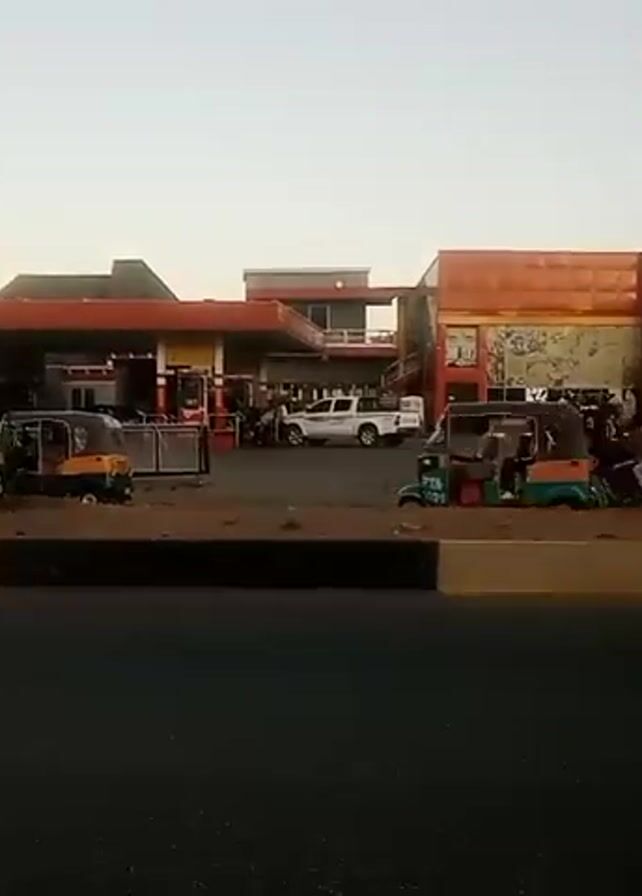 street scene during the day. On the side of the road, there's a filling station and a building labeled "JENNY KITCHEN". Several auto rickshaws, a motorcycle, and a white pickup truck are parked near the buildings. People are walking around. A black SUV drives by on the road. The sky is pale blue, suggesting either early morning or late afternoon light.