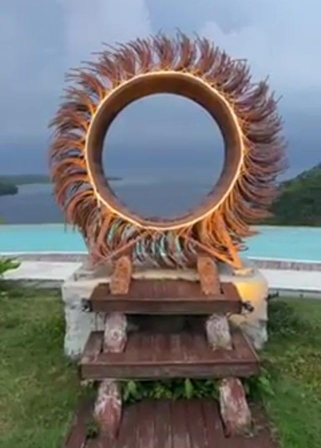 circular metal sculpture in front of a pool overlooking a body of water. The sculpture is made of rusty metal pieces arranged around a circular frame with lights along the inner circumference. It is mounted on a concrete base with wooden steps leading up to it. The pool is turquoise and appears to be an infinity pool. The water in the distance is grey, and the sky is cloudy. The sculpture is on a grassy area, and a small plant is visible to the left. The camera moves closer to the sculpture, focusing on the view through the circular frame.