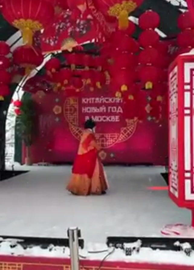 The scene captures an outdoor celebration of the Chinese New Year in Moscow, Russia, during winter
