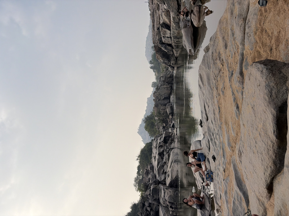 The scene depicts a natural river environment in Hale Bandi Harlapura, India, under an overcast or hazy sky. The foreground and midground consist of large, smooth, grey rock formations interspersed with patches of light brown sand. A calm body of water, likely a river, flows from the foreground towards the background, reflecting the surrounding rocks and sky. Four individuals, appearing to be adult females, are present. On the left side of the midground, three individuals are positioned on the rocks near the water's edge. One is in a crouching posture, facing the water. The other two are seated; one is wearing a dark top and light-colored bottoms with a dark skirt or wrap, and the other is wearing a light top. A patterned blue and white bag is visible on the rock beside them, along with several pairs of black sandals. Further into the midground, on the right side of the water, a fourth individual is seated on a rock near the water, partially obscured, with their reflection clearly visible in the water. This individual appears to be wearing dark swimwear or a dark top and bottoms. The river is flanked on both sides by extensive formations of large, grey boulders and rocks, with sparse green vegetation and trees visible on and between the rock formations, particularly on the left bank. Distant hills or mountains are discernible in the far background beneath the pale sky. The overall impression is a serene, rugged landscape.